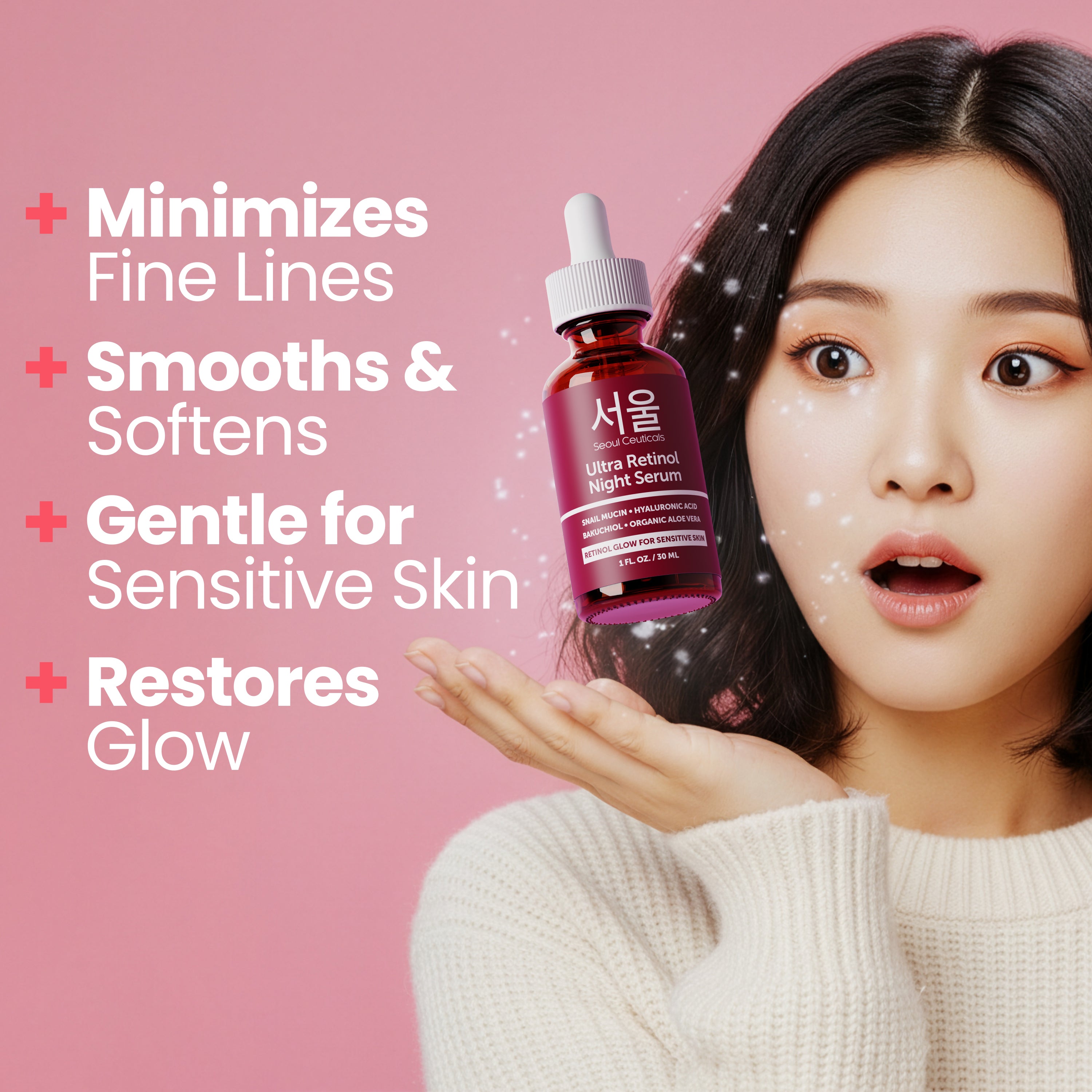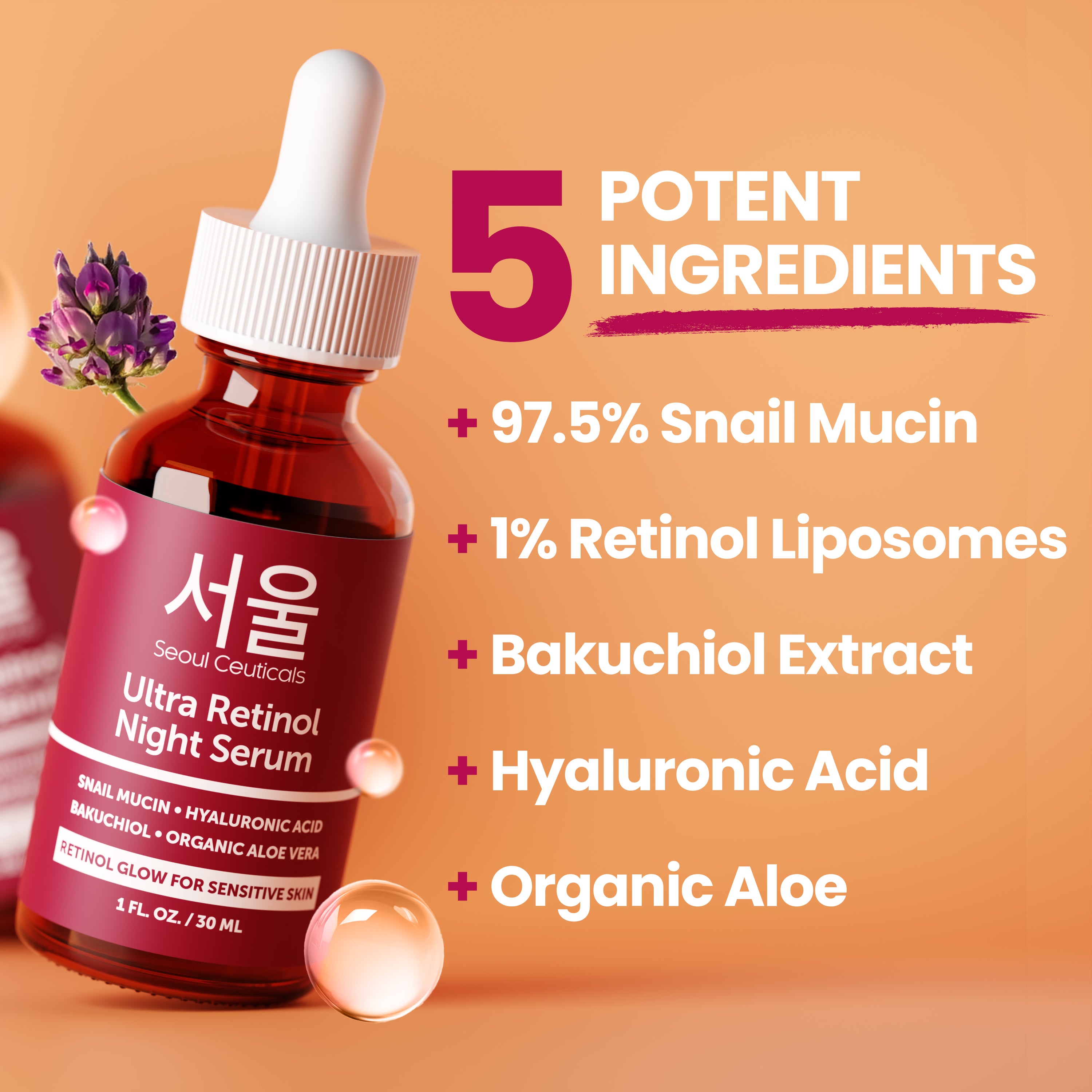Seoul Ceuticals Ultra Retinol Serum is a revolutionary blend of ancient Korean beauty secrets with modern skin science. Immerse your skin in the power of 97.5% concentrated Snail Mucin, Hyaluronic Acid, and Bakuchiol. Proudly presenting a formula that is 95% natural, 35% organic, and unmistakably 100% cruelty-free, this serum epitomizes the pinnacle of Korean skincare standards.